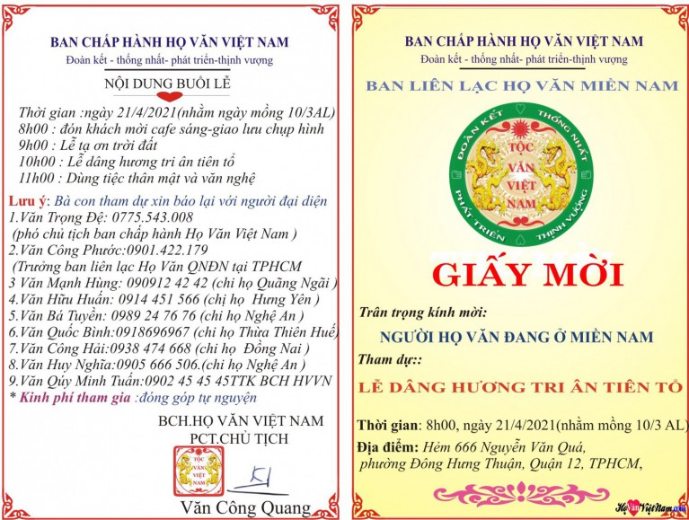 Thay mặt BLL cảm ơn sự tham gia ủng hộ và đồng ý của các vị trong ban chấp hành Họ Văn Việt Nam và đại diện các chi họ trện cả nước tại miền nam.